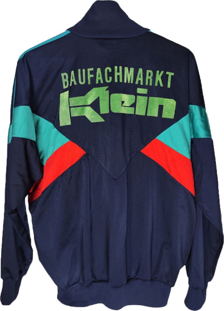 Diese Trainingsjacke wurde von unseren Mannschaften mindestens in den Saisons 1988 bis 1991 getragen. Sie steht sinnbildlich für eine besondere Zeit unseres Vereins – unter anderem für den Aufstieg in die Kreisliga A in der Saison 1990/91. Entsprechend viele schöne Erinnerungen, Emotionen und Erfolge sind mit diesem Kleidungsstück verbunden.