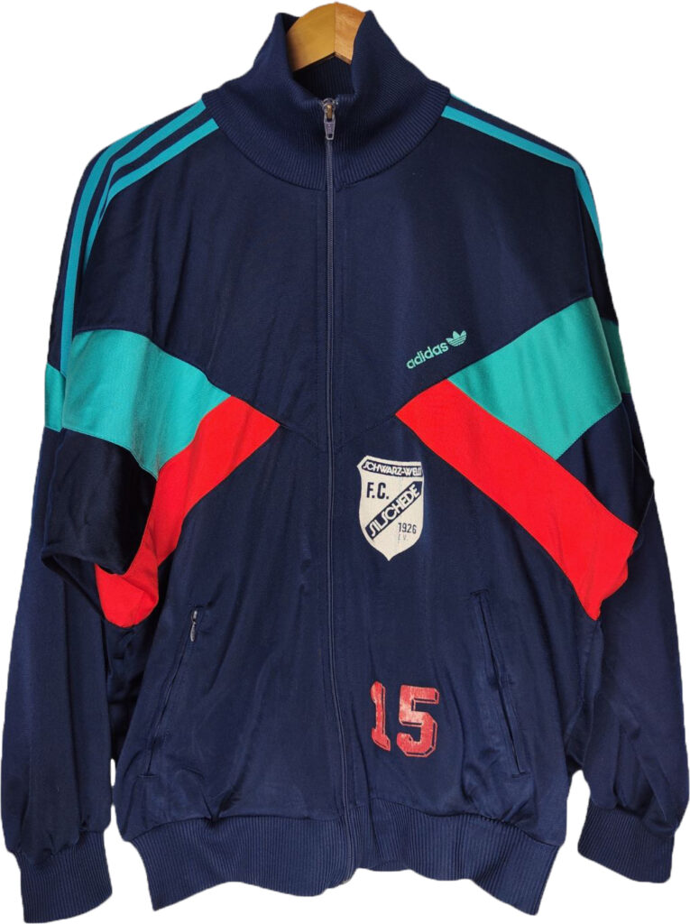 Eine originale Trainingsjacke im Stil der 90er Jahre, in klassischem Dunkelblau mit türkisen und roten Akzenten. Ein Hingucker, der nicht nur Erinnerungen weckt, sondern auch heute – ja sogar 2026 – absolut modern und tragbar ist.